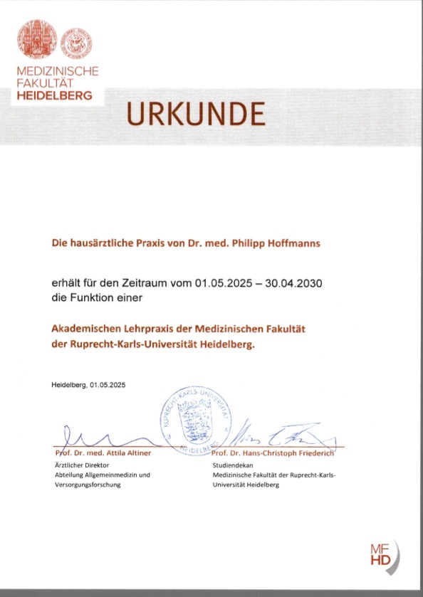 - Unsere Praxis ist „akademische Lehrpraxis“ der Universitätskliniken Heidel und Freiburg.
